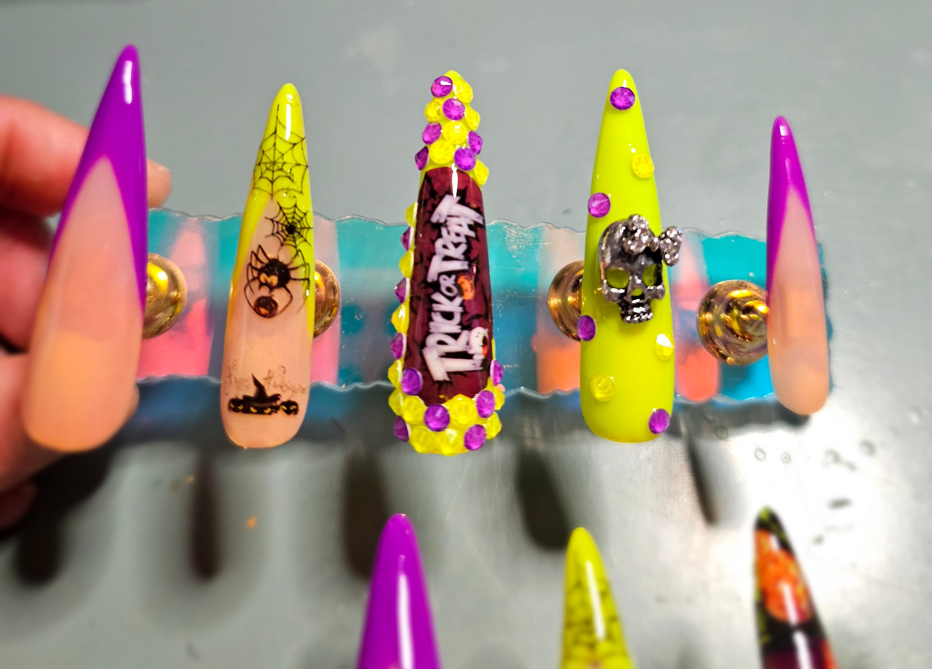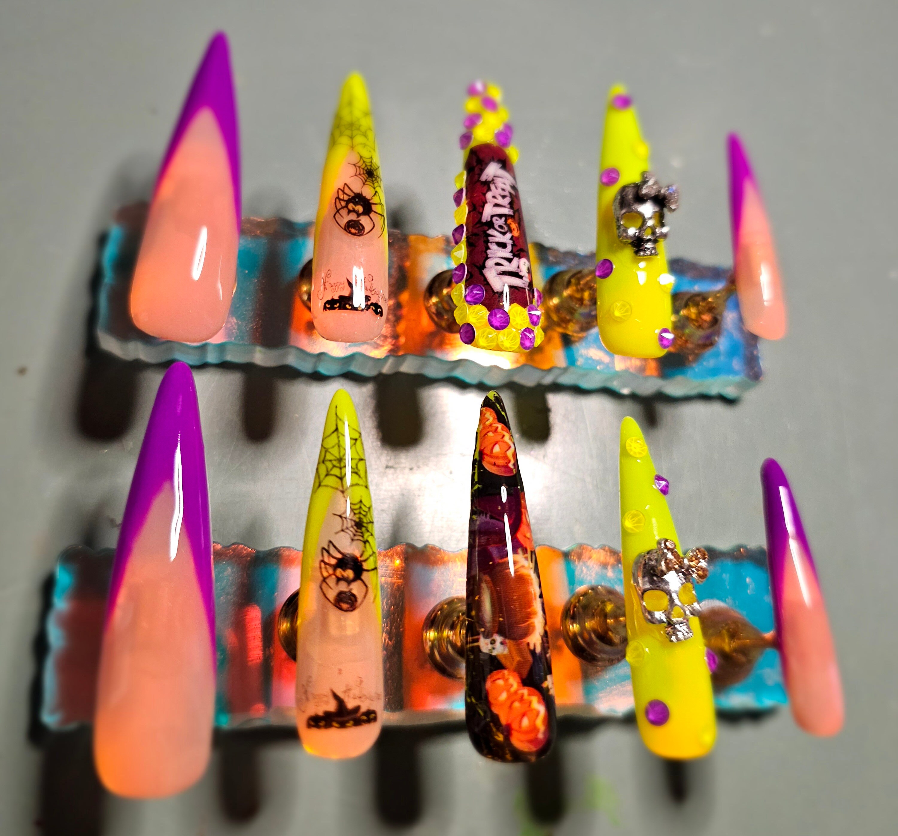 Halloween Nails! 🎃 purple and glow in the dark greenish yellow.