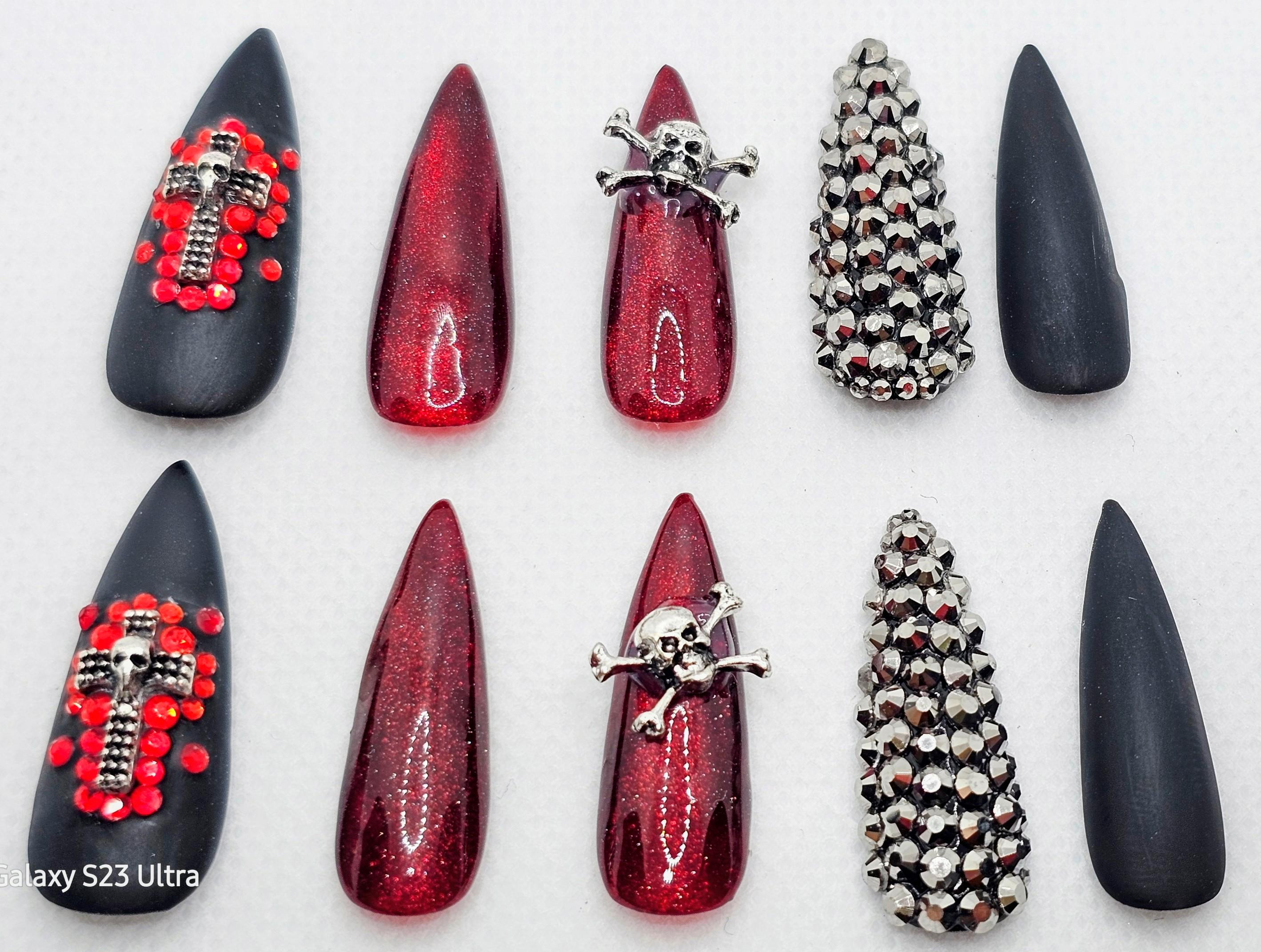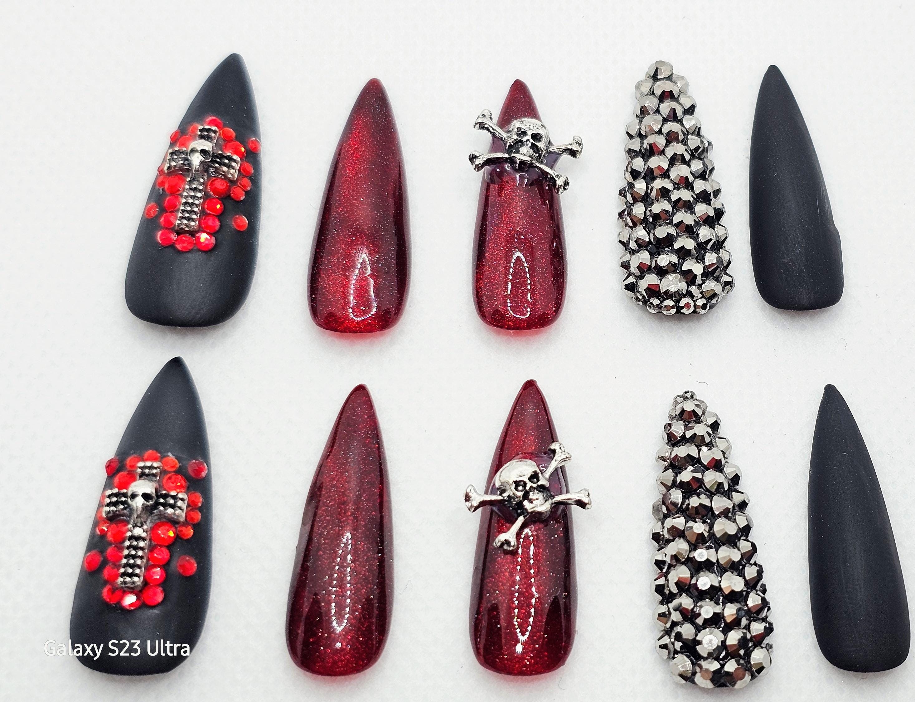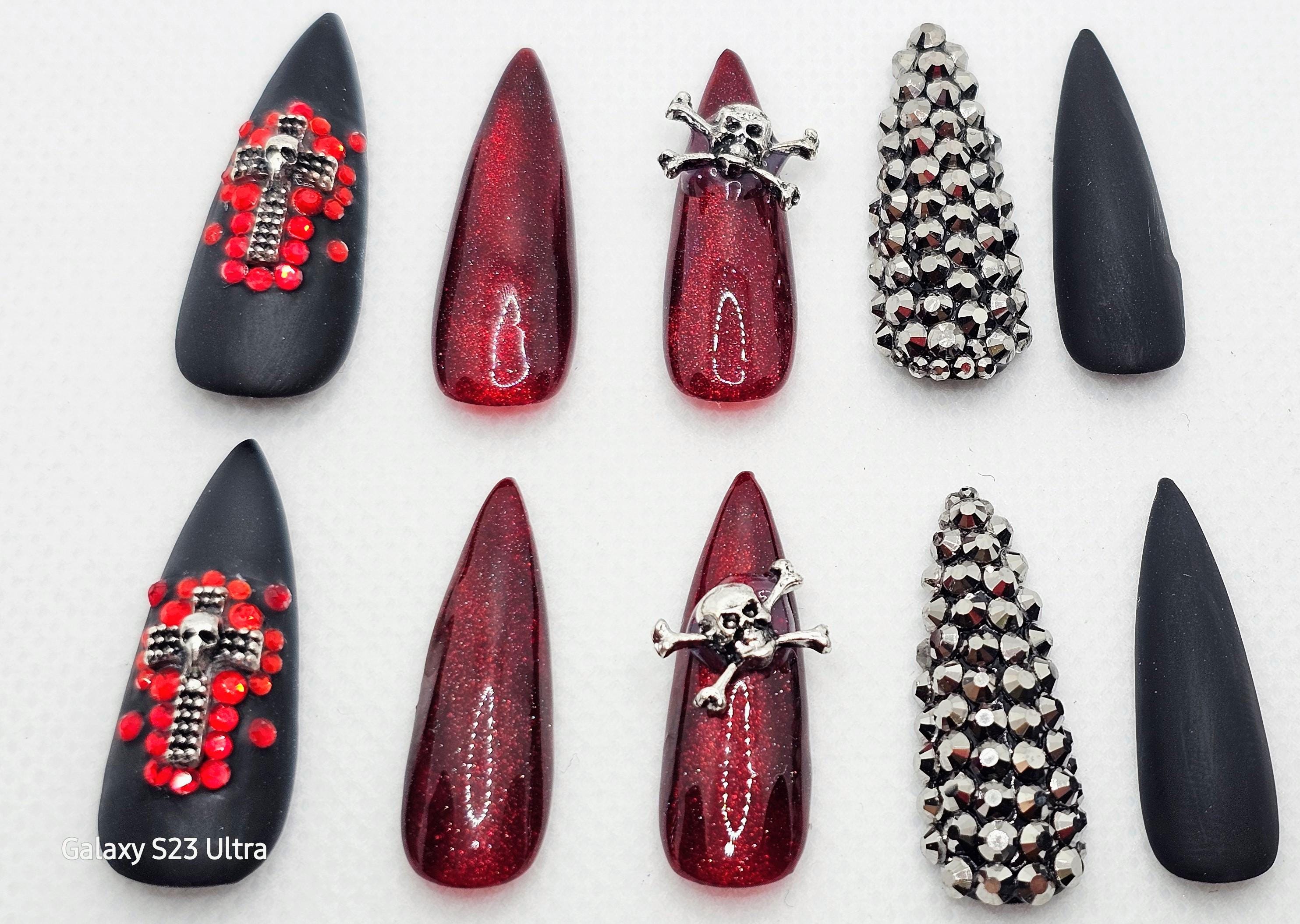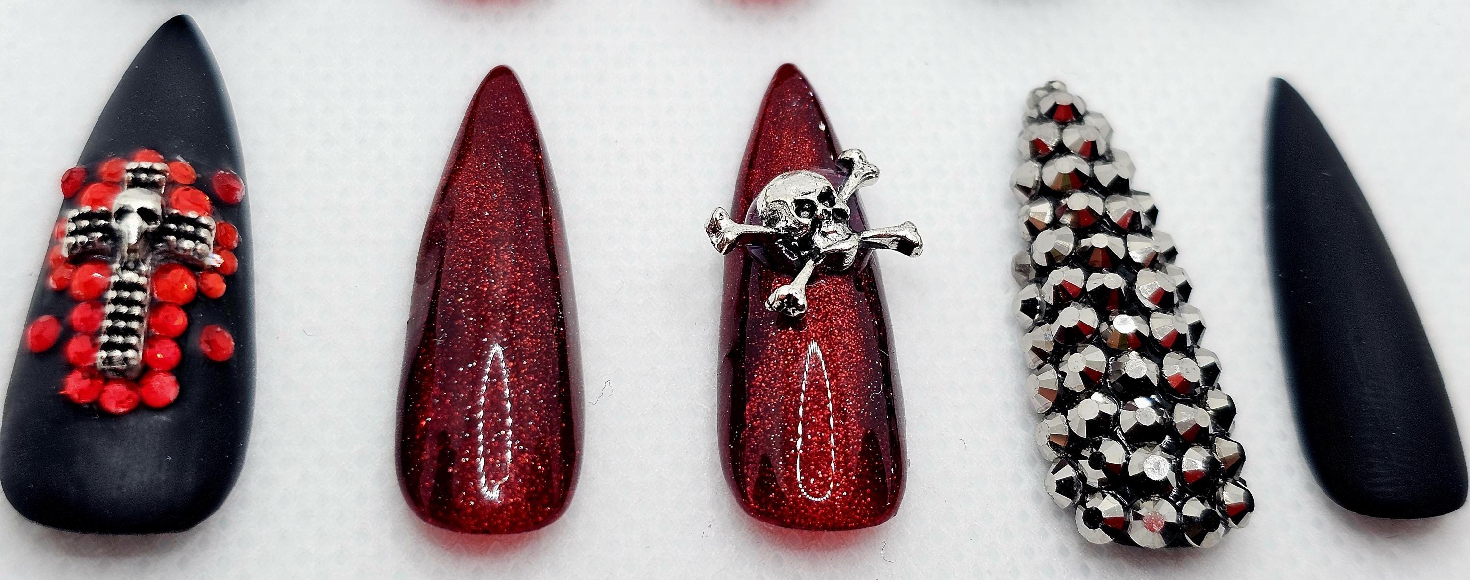 Gothic Halloween Press-On Nails: Skull, Cross, Rhinestone