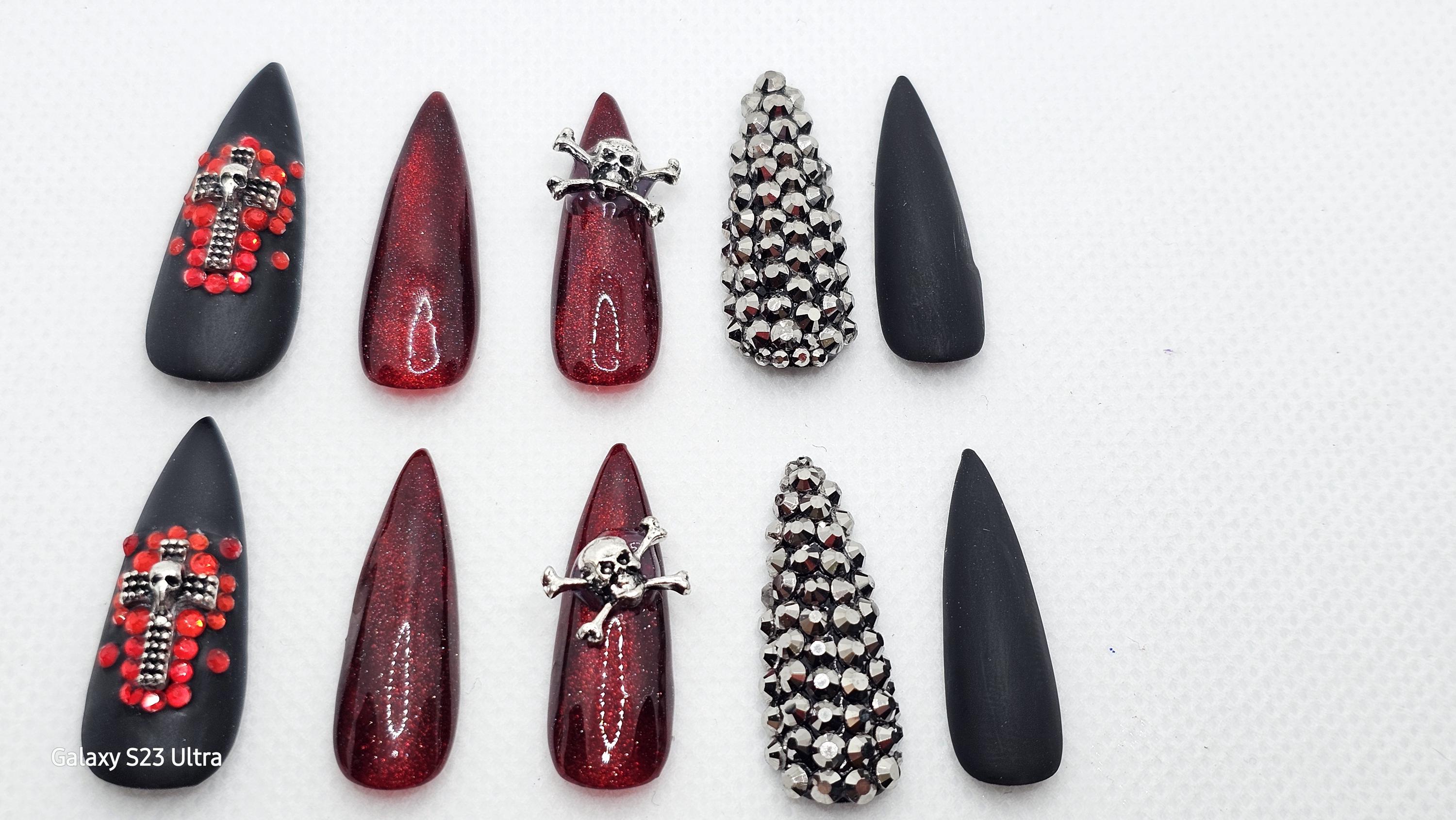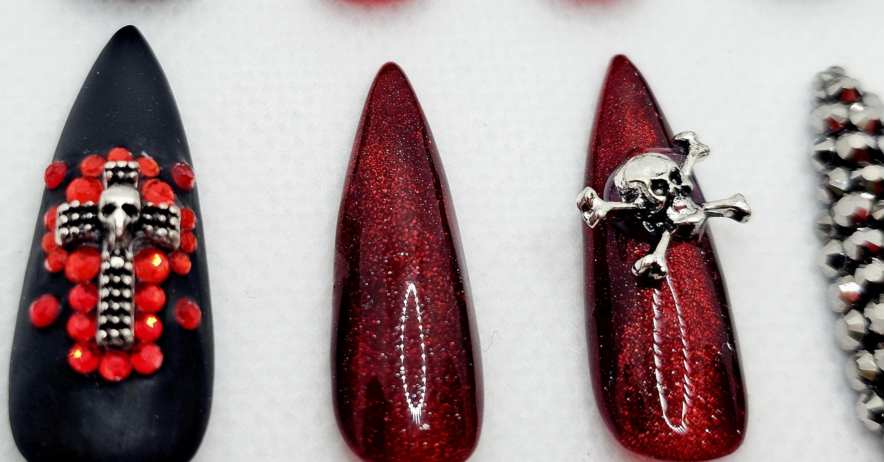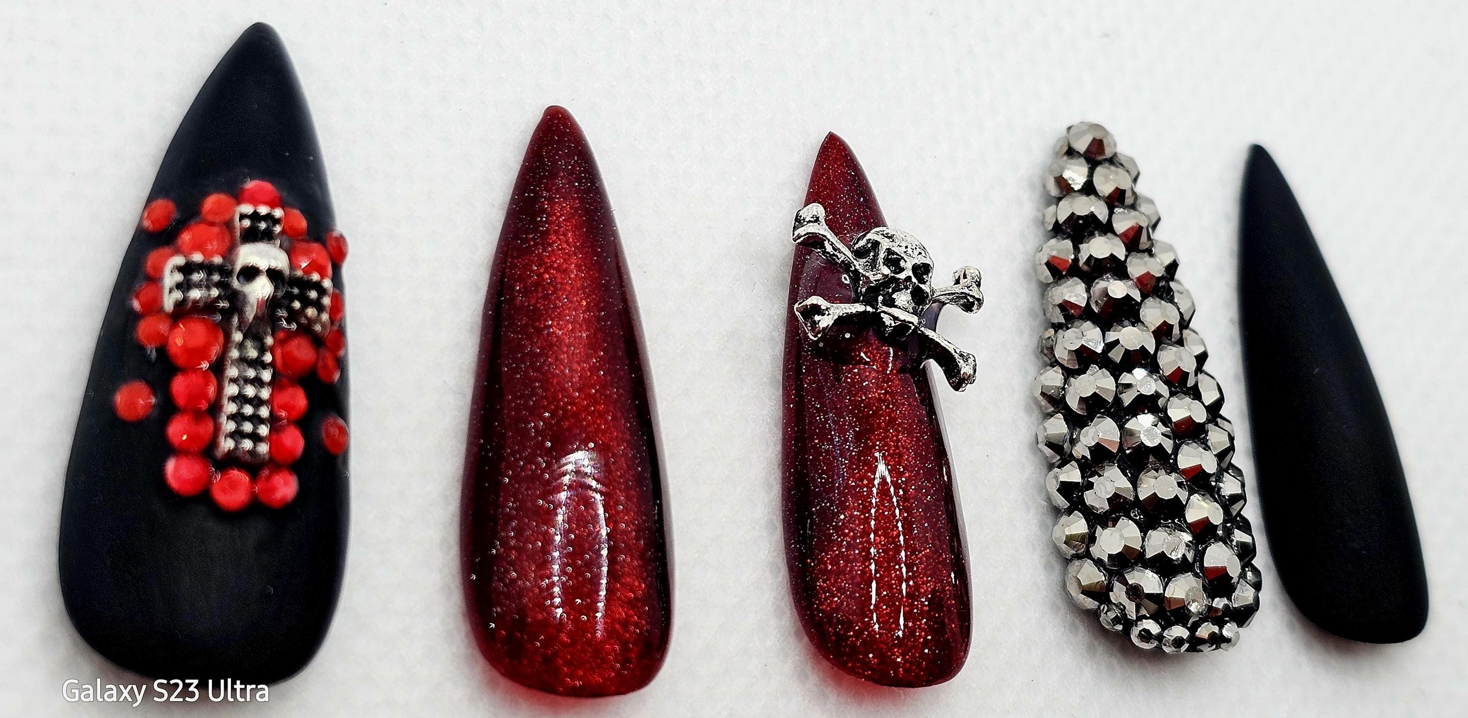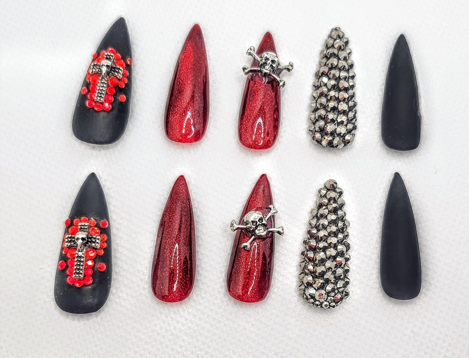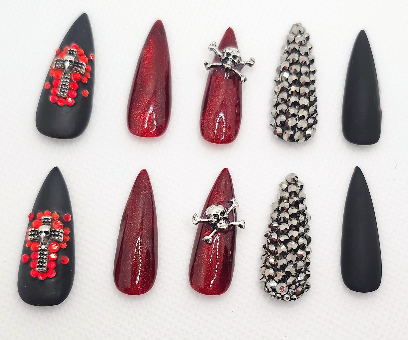 Gothic Halloween Press-On Nails: Skull, Cross, Rhinestone