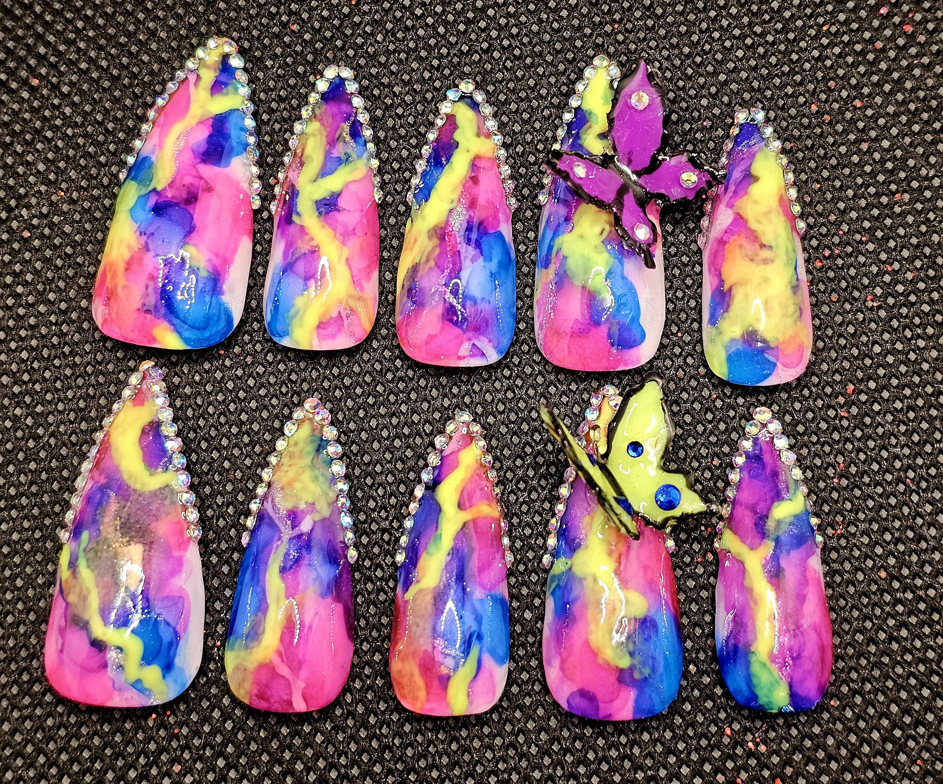 Hot pink, bold blue marble stiletto nails