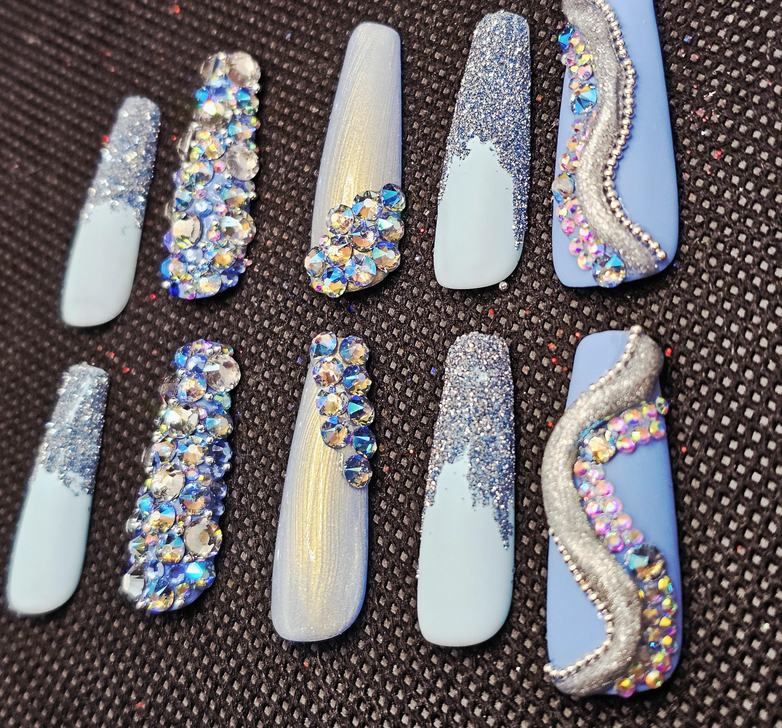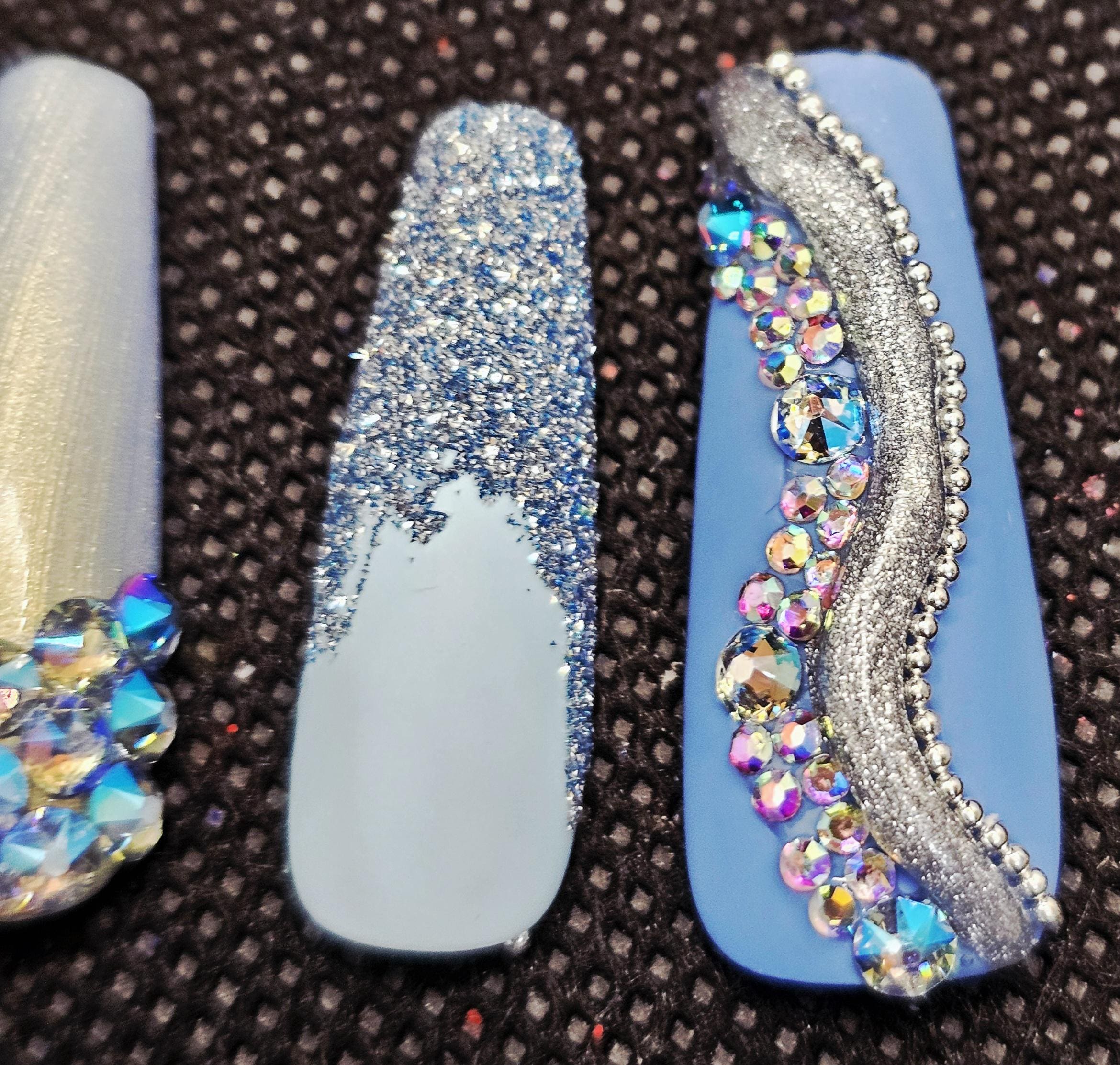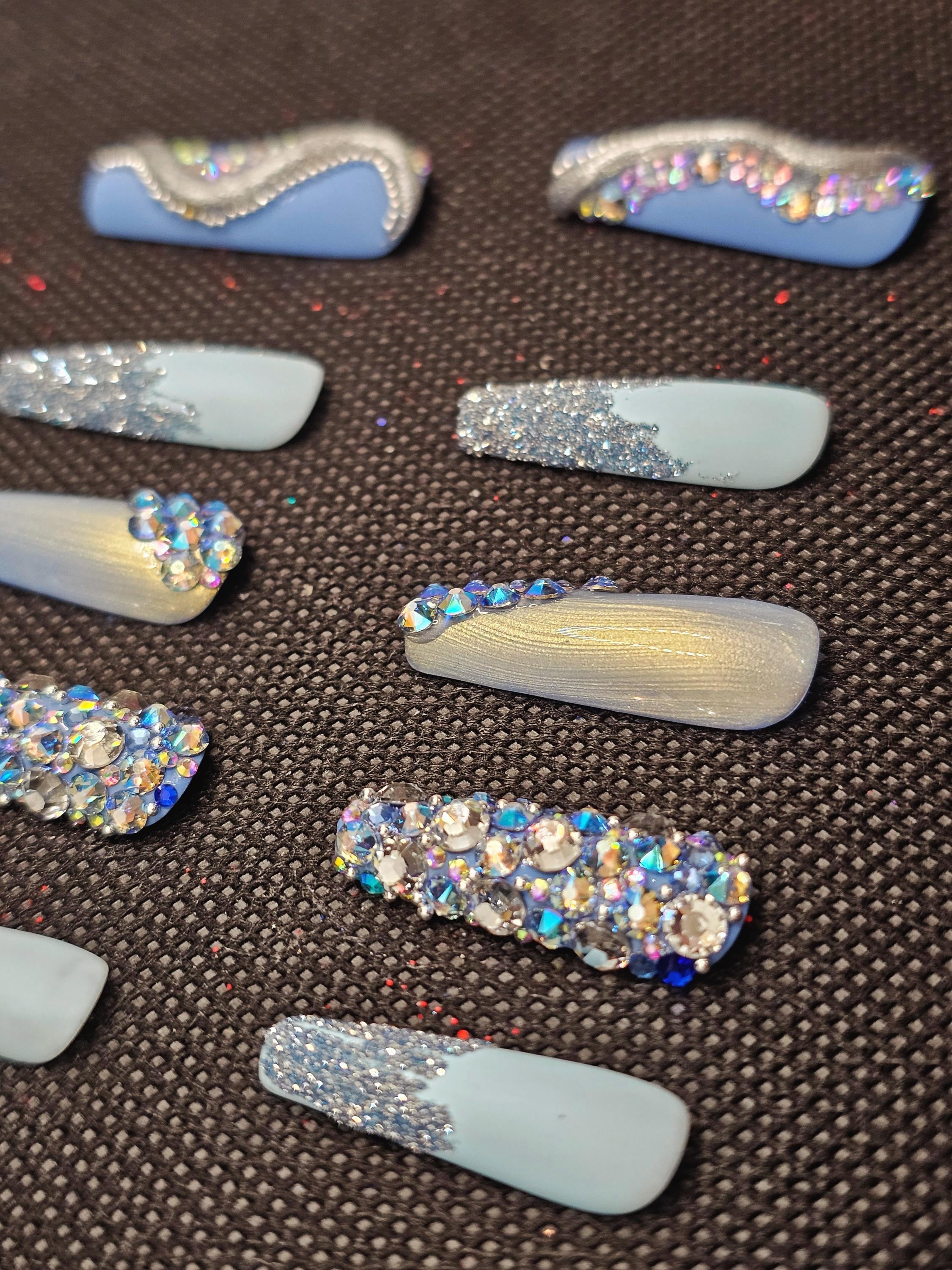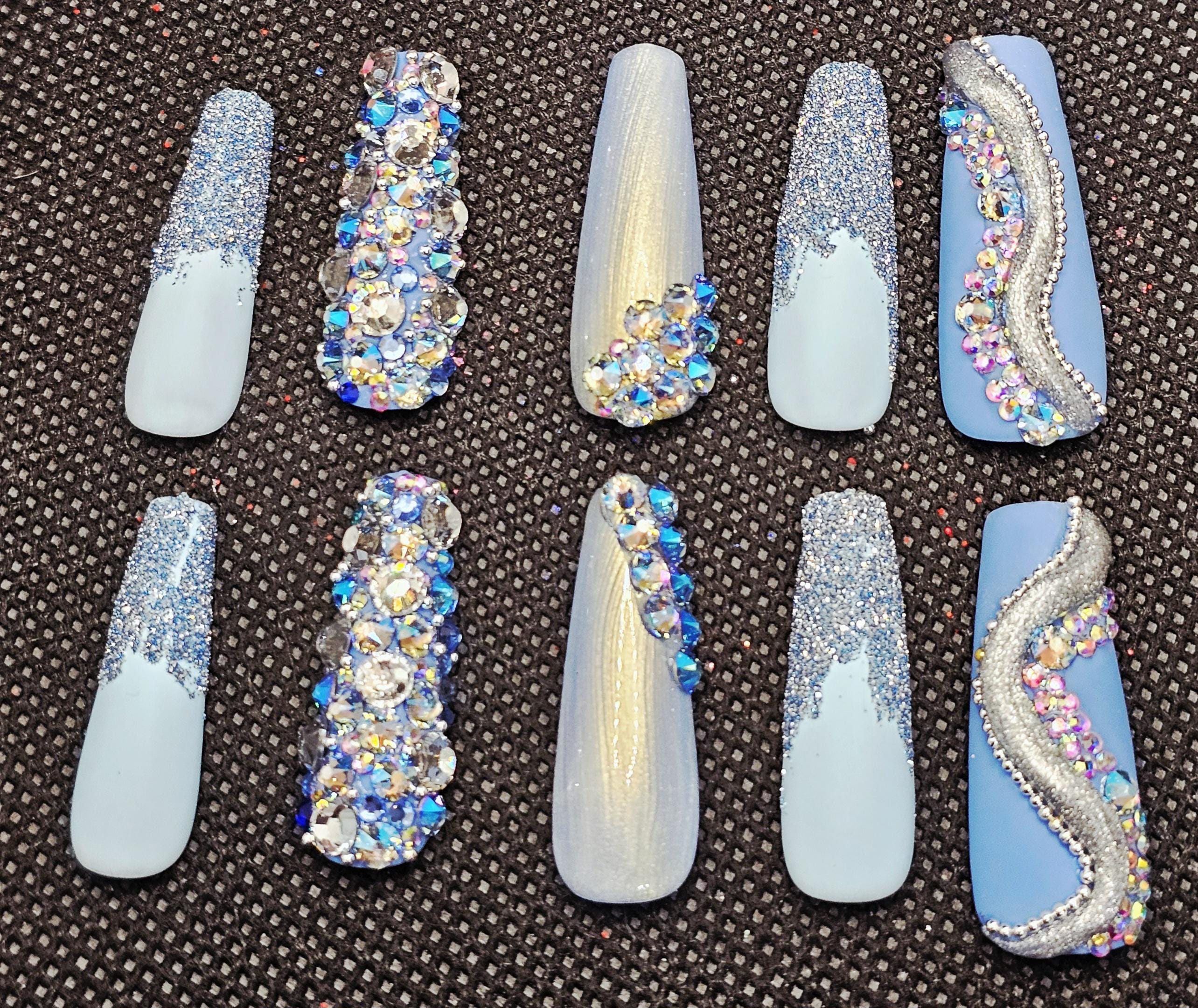 Blue bling spring nails medium length coffin